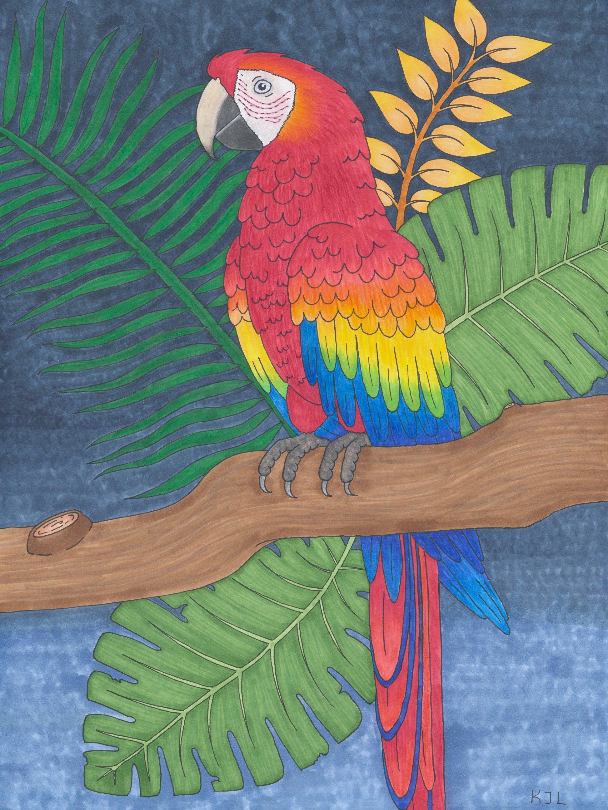 En rolig, håndtegnet illustration med en farverig papegøje omgivet af bløde, grønne blade.