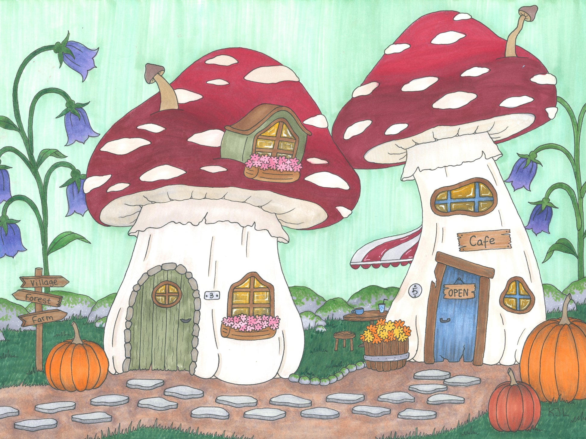 En stemningsfuld, håndtegnet illustration med små svampehuse i et roligt, fantasifuldt landskab.